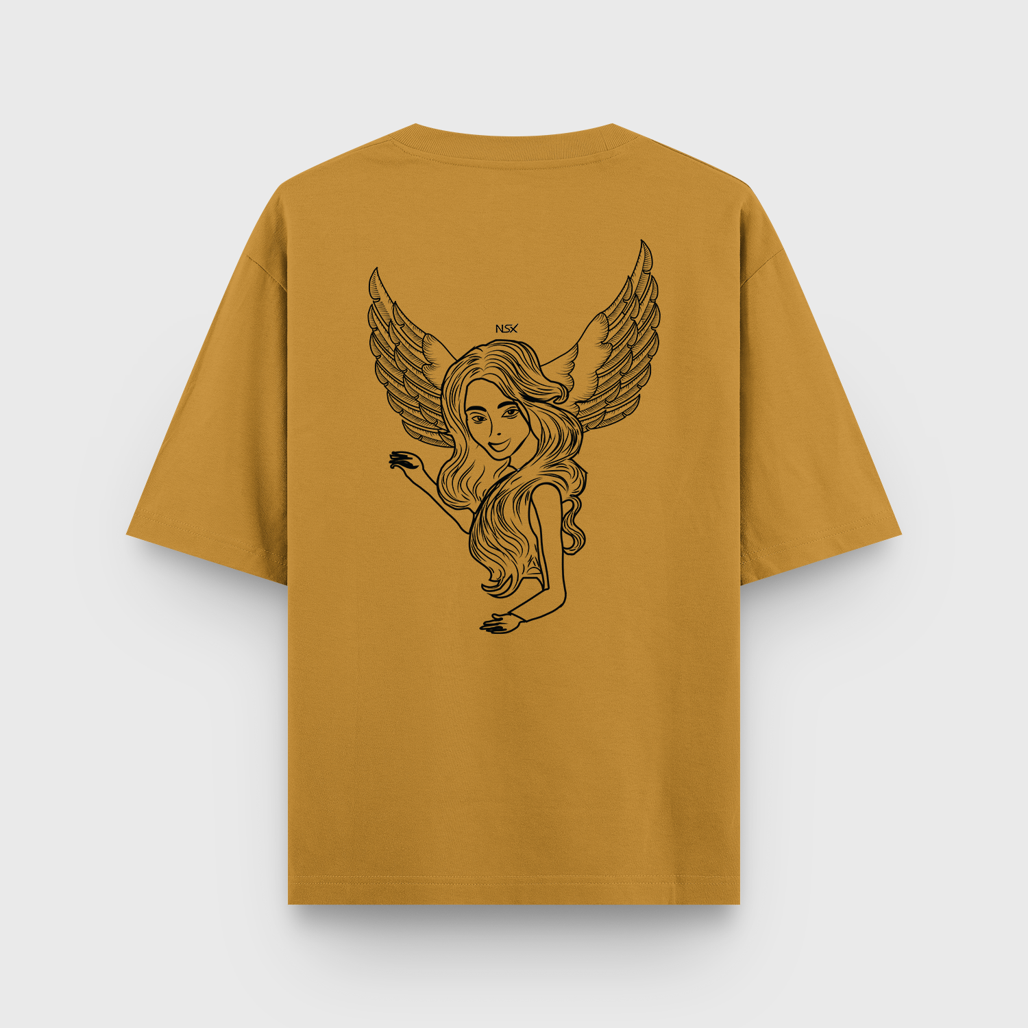 Turn heads with this fiery oversized tee featuring an intricate line-art angel design on the back. Bold yet ethereal, the flowing hair and powerful wings capture strength, freedom, and untamed beauty.