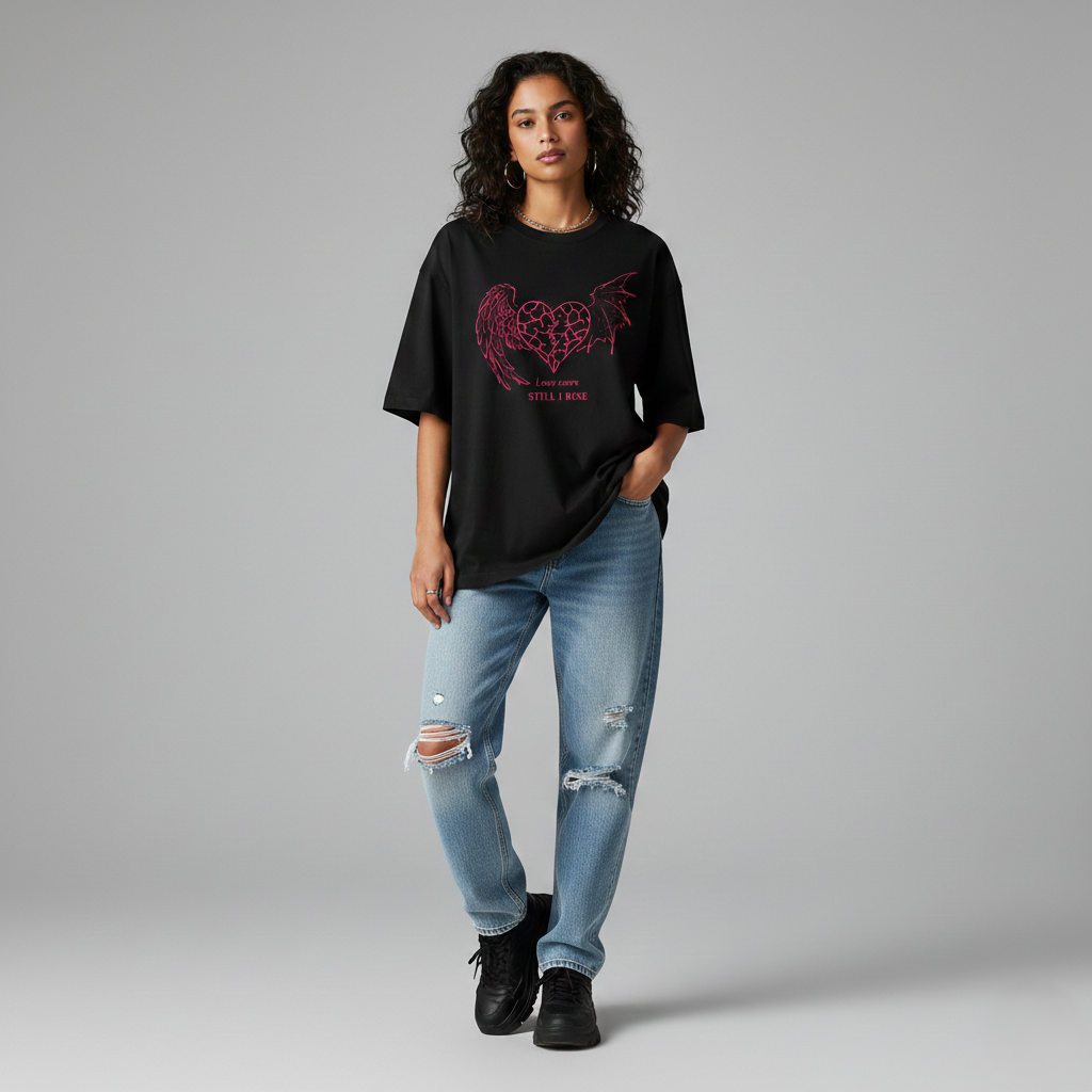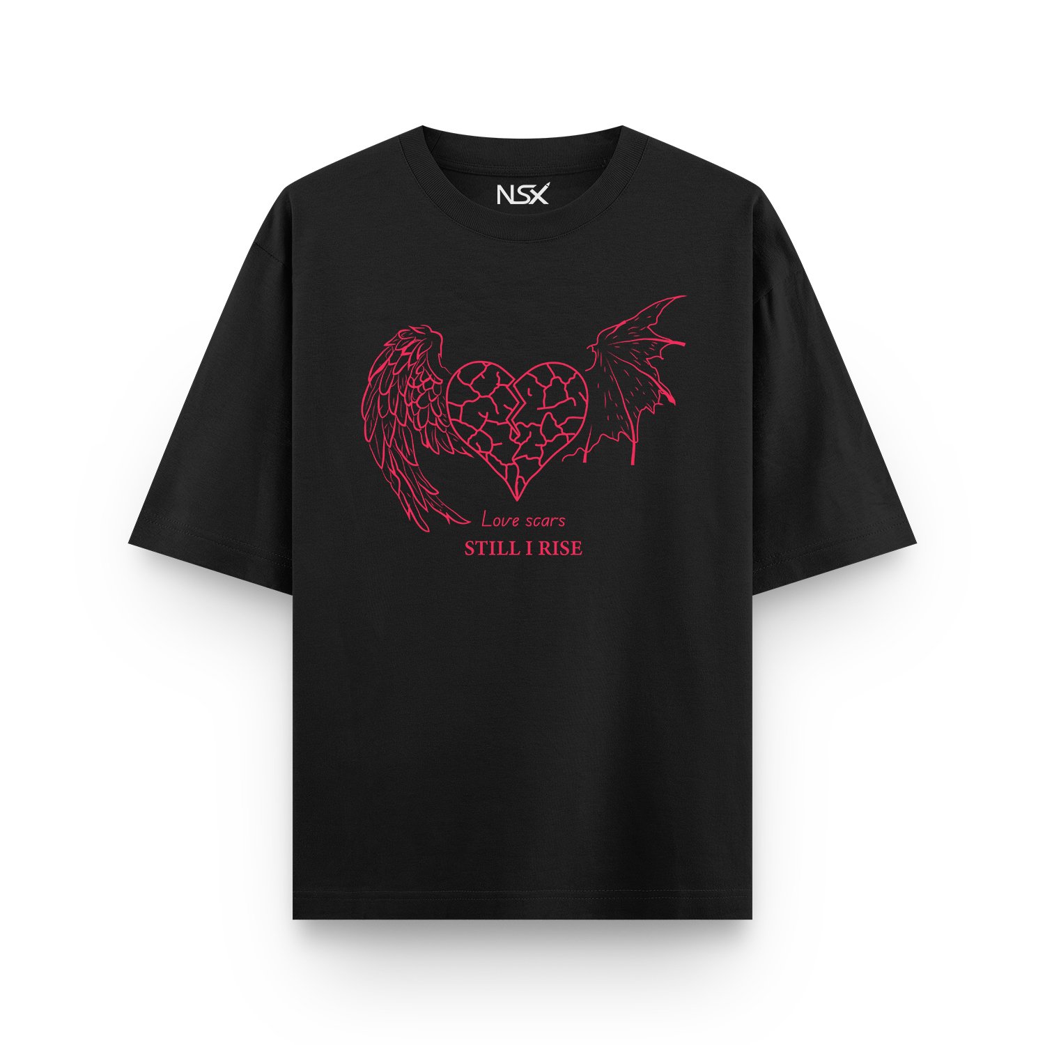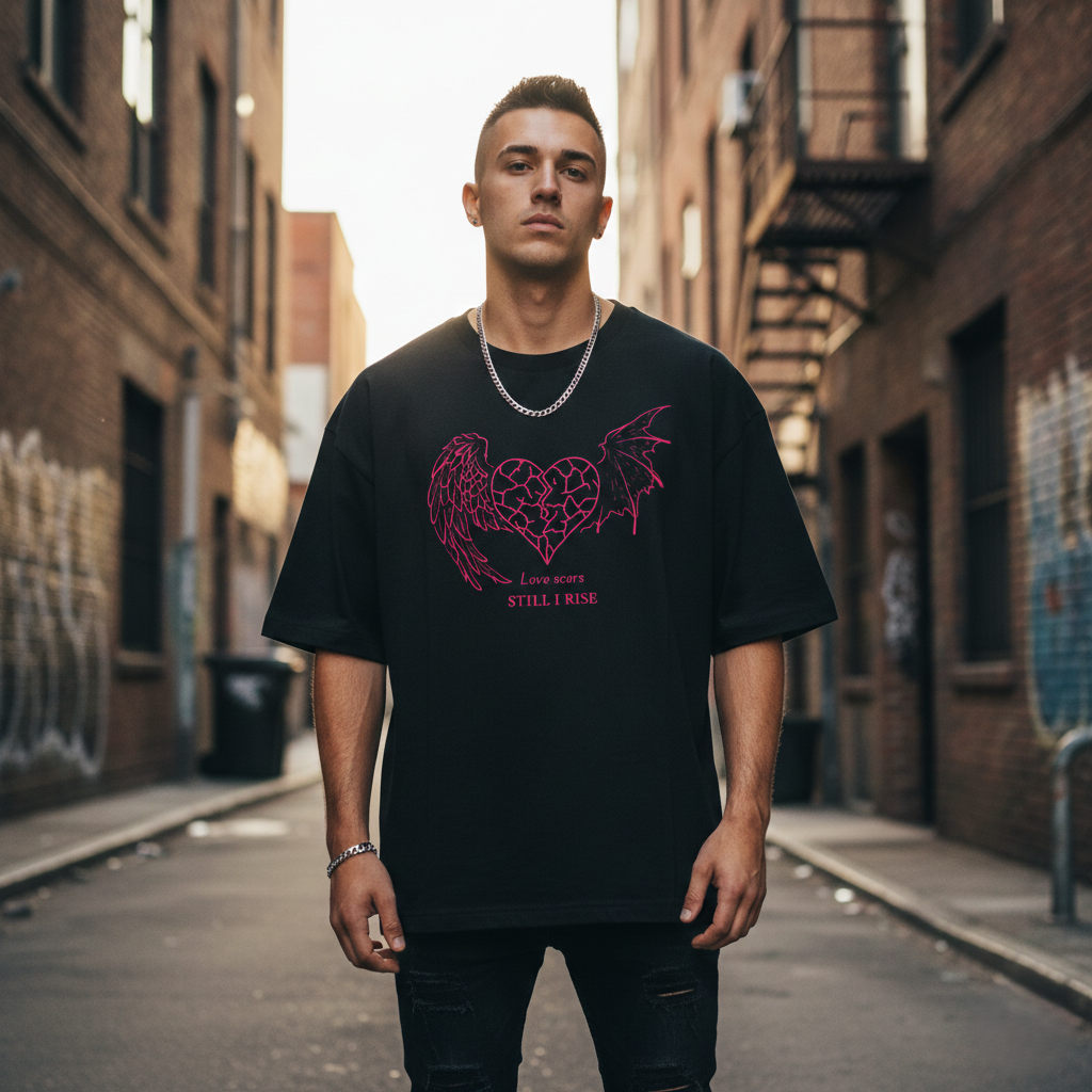 This isn’t just a t-shirt; it’s a statement of resilience. Part of our exclusive Love Scars collection, this piece balances gritty streetwear aesthetics with a powerful message of overcoming adversity. The central graphic features a cracked heart flanked by two distinct wings—one angelic and one draconic (or bat-like). This represents the duality of the human experience: the struggle and the ascent.