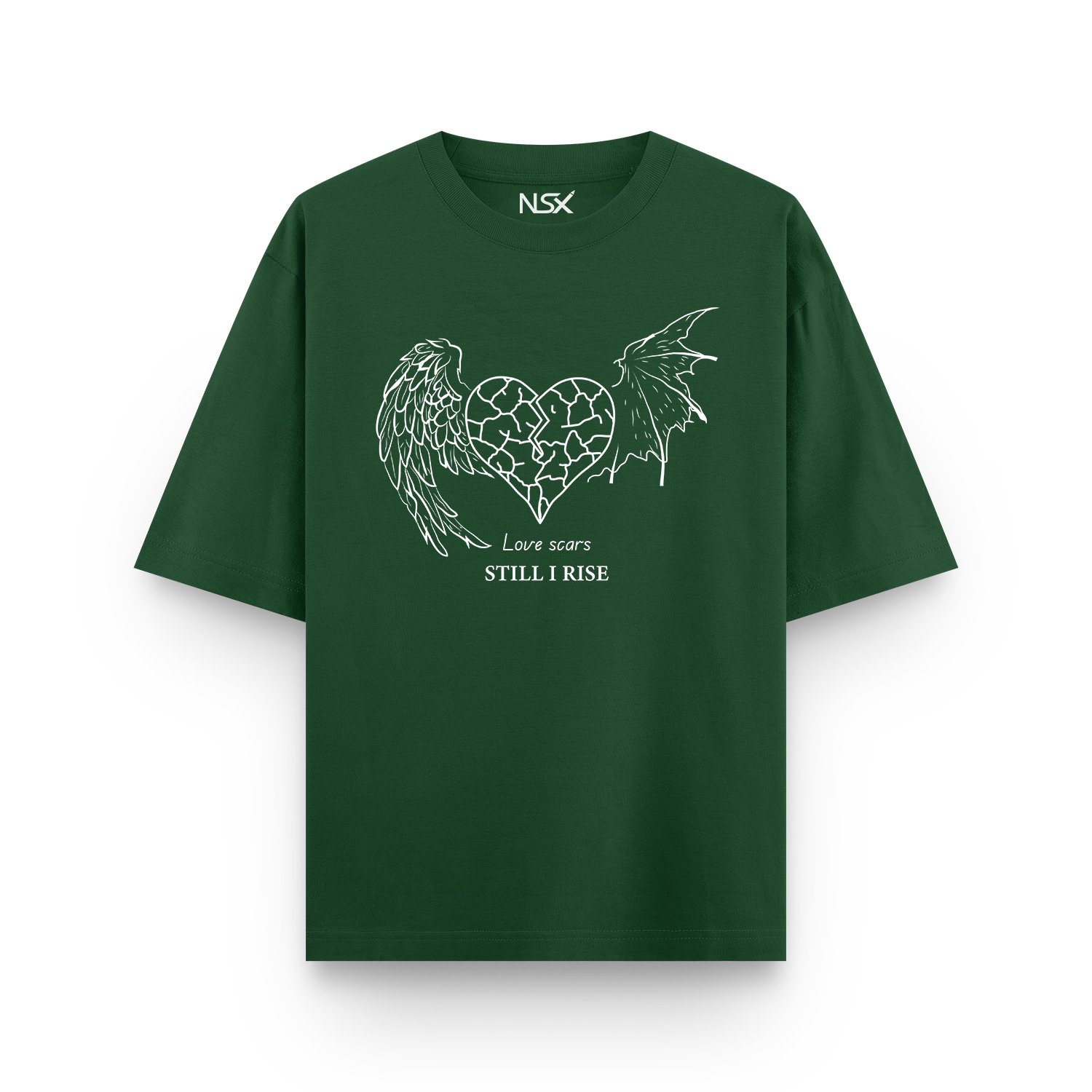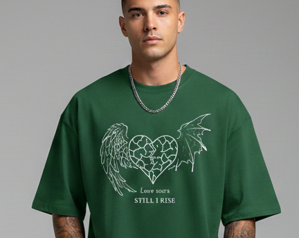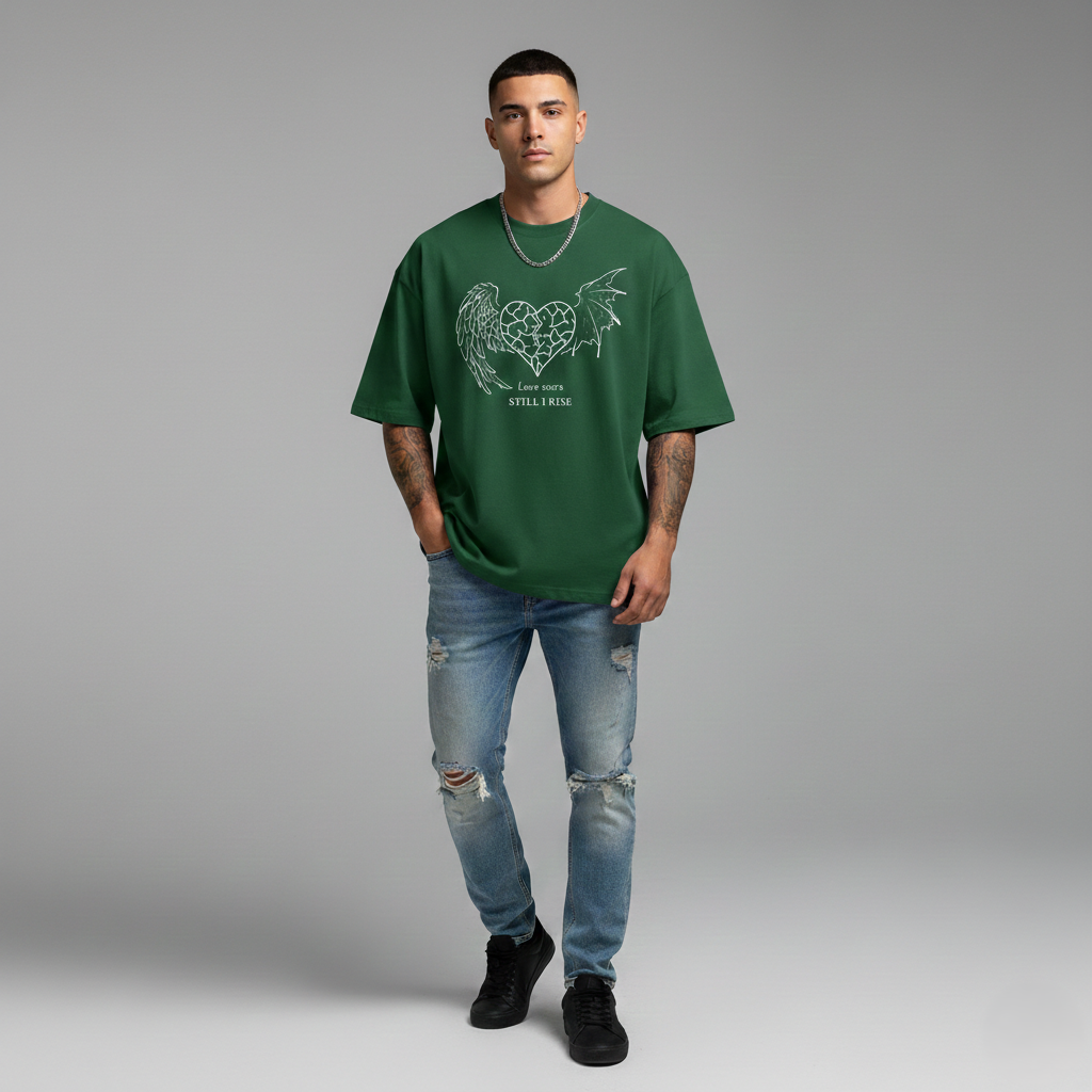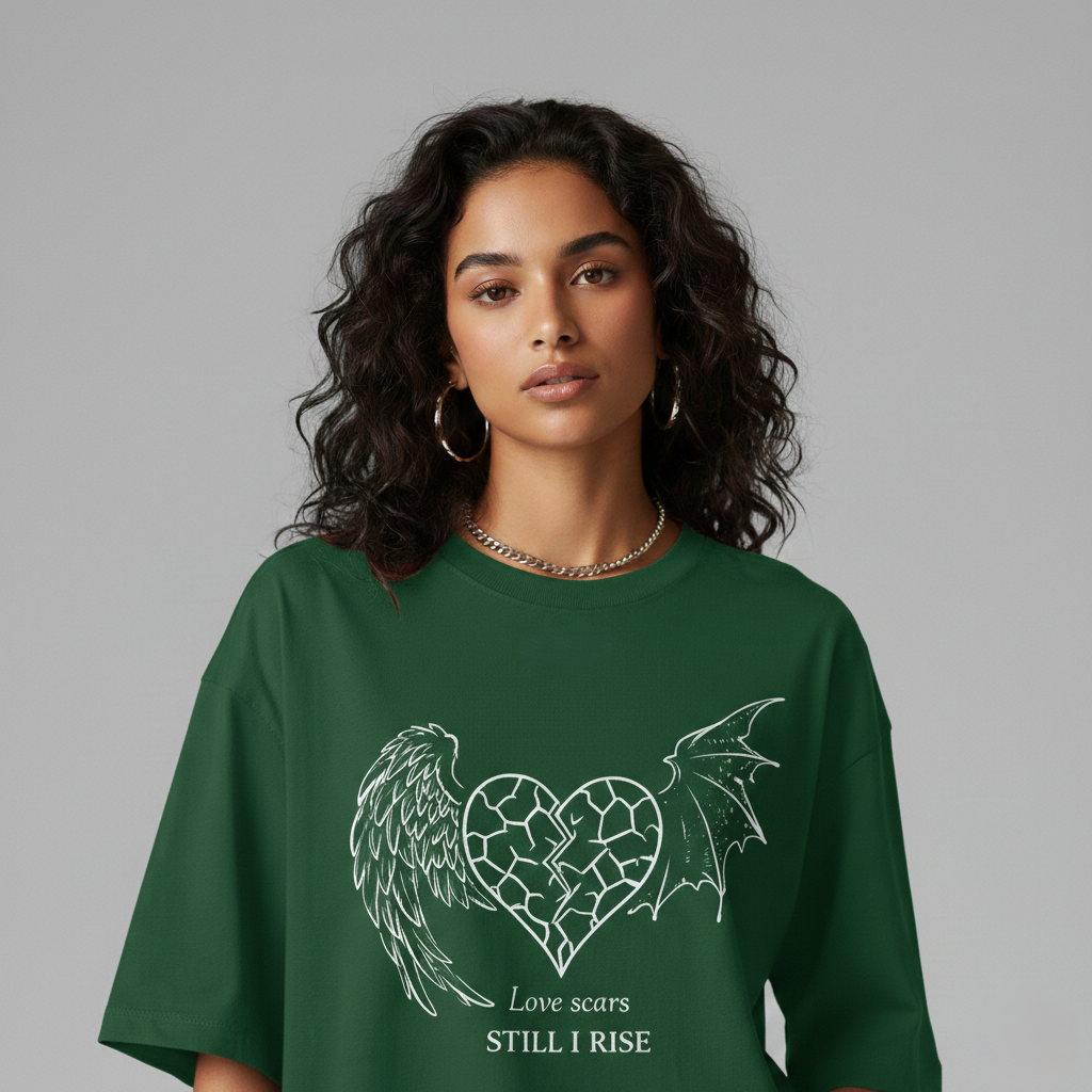 This isn’t just a t-shirt; it’s a statement of resilience. Part of our exclusive Love Scars collection, this piece balances gritty streetwear aesthetics with a powerful message of overcoming adversity. The central graphic features a cracked heart flanked by two distinct wings—one angelic and one draconic (or bat-like). This represents the duality of the human experience: the struggle and the ascent.
