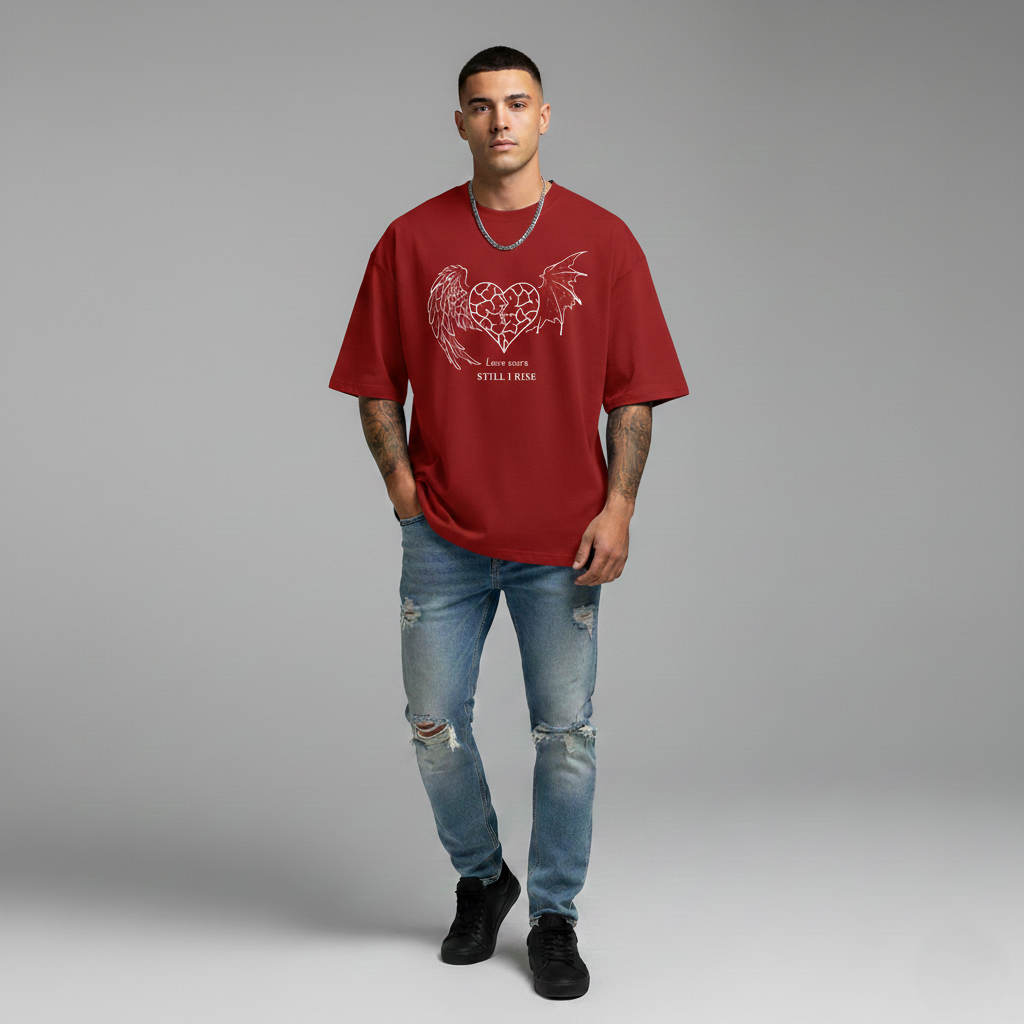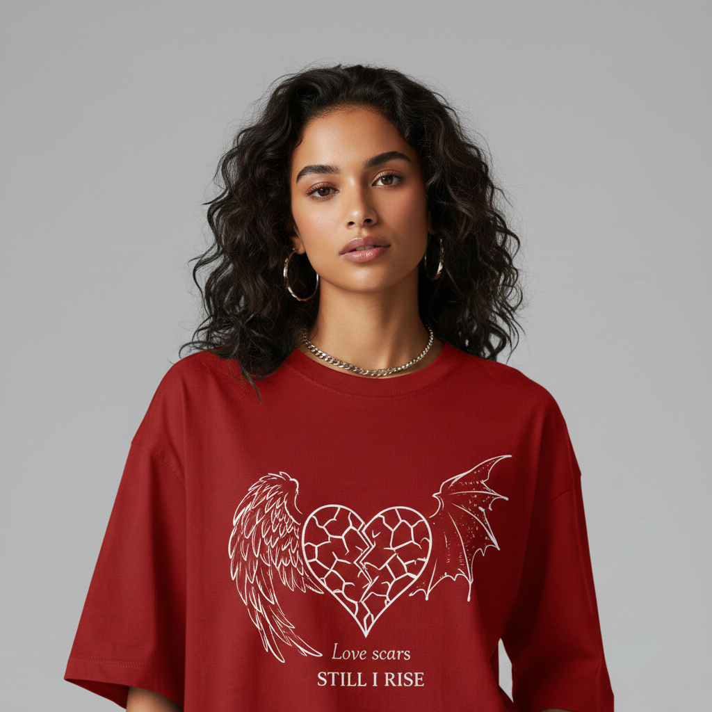 This isn’t just a t-shirt; it’s a statement of resilience. Part of our exclusive Love Scars collection, this piece balances gritty streetwear aesthetics with a powerful message of overcoming adversity. The central graphic features a cracked heart flanked by two distinct wings—one angelic and one draconic (or bat-like). This represents the duality of the human experience: the struggle and the ascent.