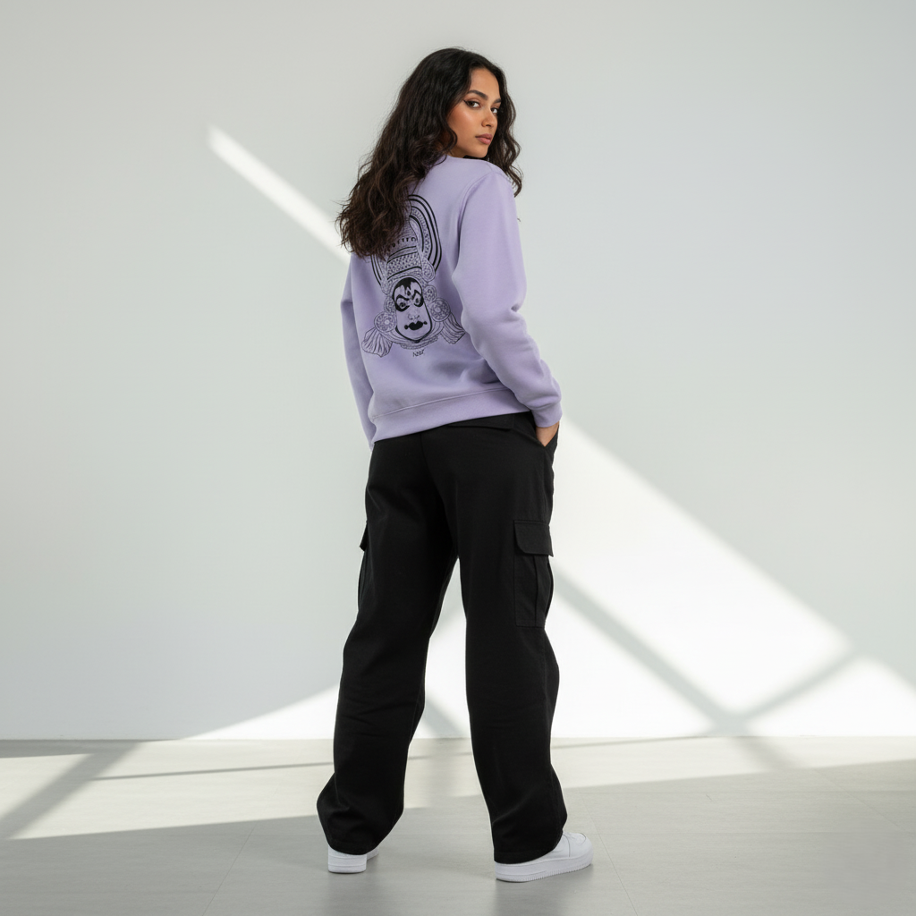 This unisex sweatshirt features a striking Kathakali-inspired line art — a tribute to Kerala’s timeless dance drama, reimagined with a raw, modern edge. The minimalist strokes capture the spirit, expression, and artistry of Indian roots while keeping it effortlessly urban.